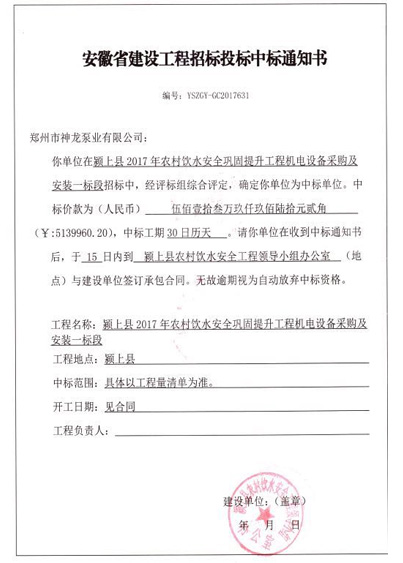 祝賀我司在安徽省農村飲水工程中標513萬余元