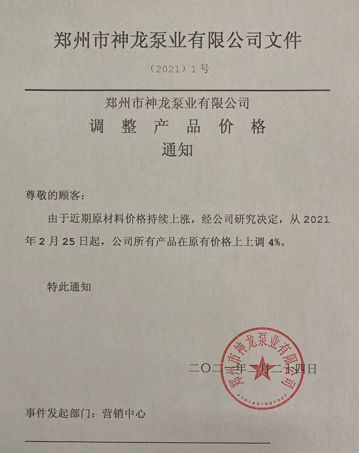 本公司所有產品于2021年3月1日起在12月15日調價的基礎上銷售價格再次上調4%